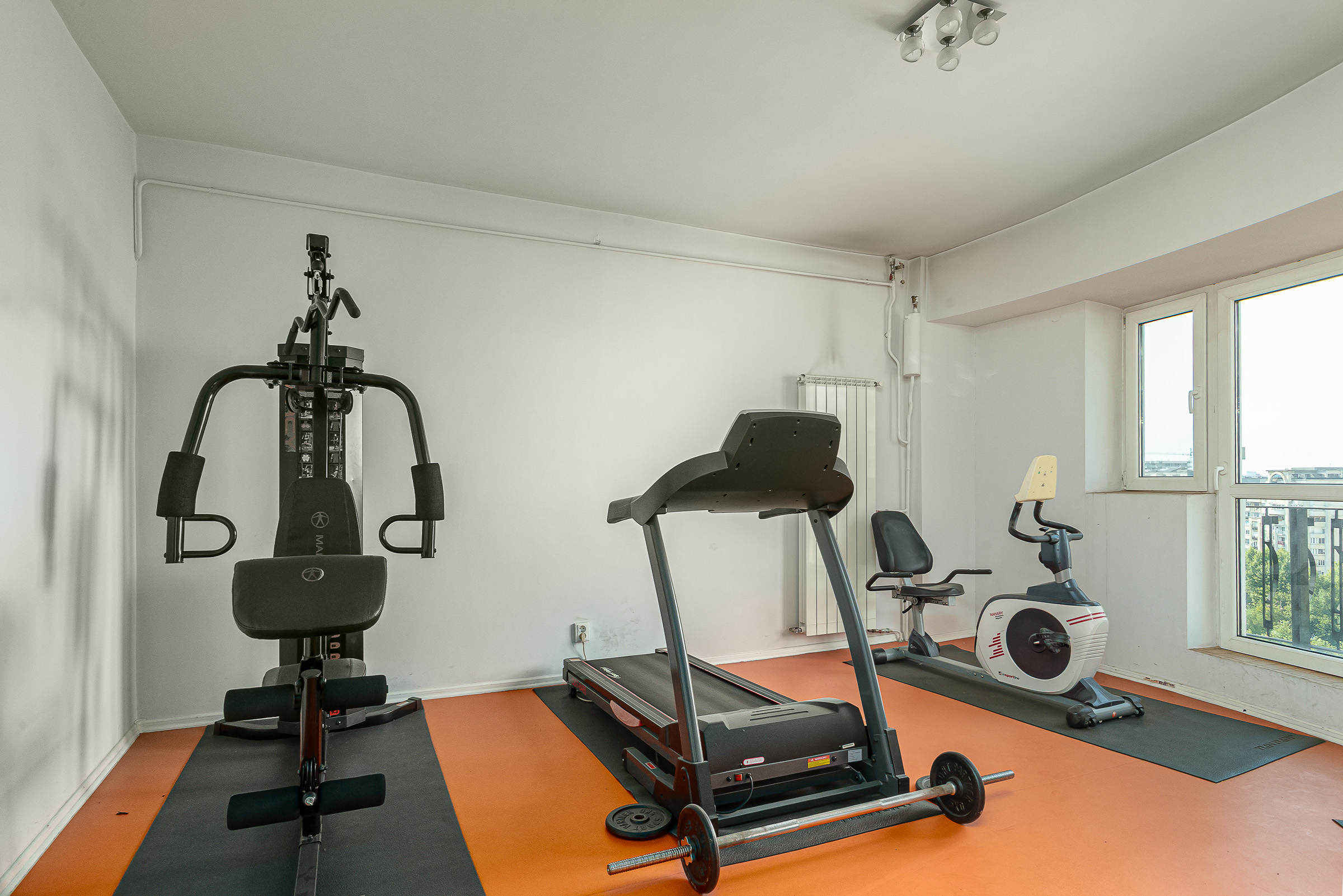 Dar sa vedem blocul. Pentru ca nu toate sunt la fel. Acesta, de exemplu, este unul "norocos". Datorita pozitiei, beneficiaza de niste contracte importante de publicitate pentru reclamele luminoase amplasate pe cladire. Asta aduce lunar venituri consistente in casieria asociatiei de proprietari. Bani care sunt constant investiti: renovarea si intretinerea spatiilor comune, imbunatatirea si intretinerea teraselor si a subsolului, dar si crearea unui spatiu amenajat si utilat de asociatie pentru locatari, cu destinatia de sala de sport. Adica locul unde poti face miscare la un nivel mai mare decat ai putea face acasa, fara sa parasesti locatia. Si unde, evident, poti urca in halat si cu cafeaua in mana, fara sa iesi din bloc.