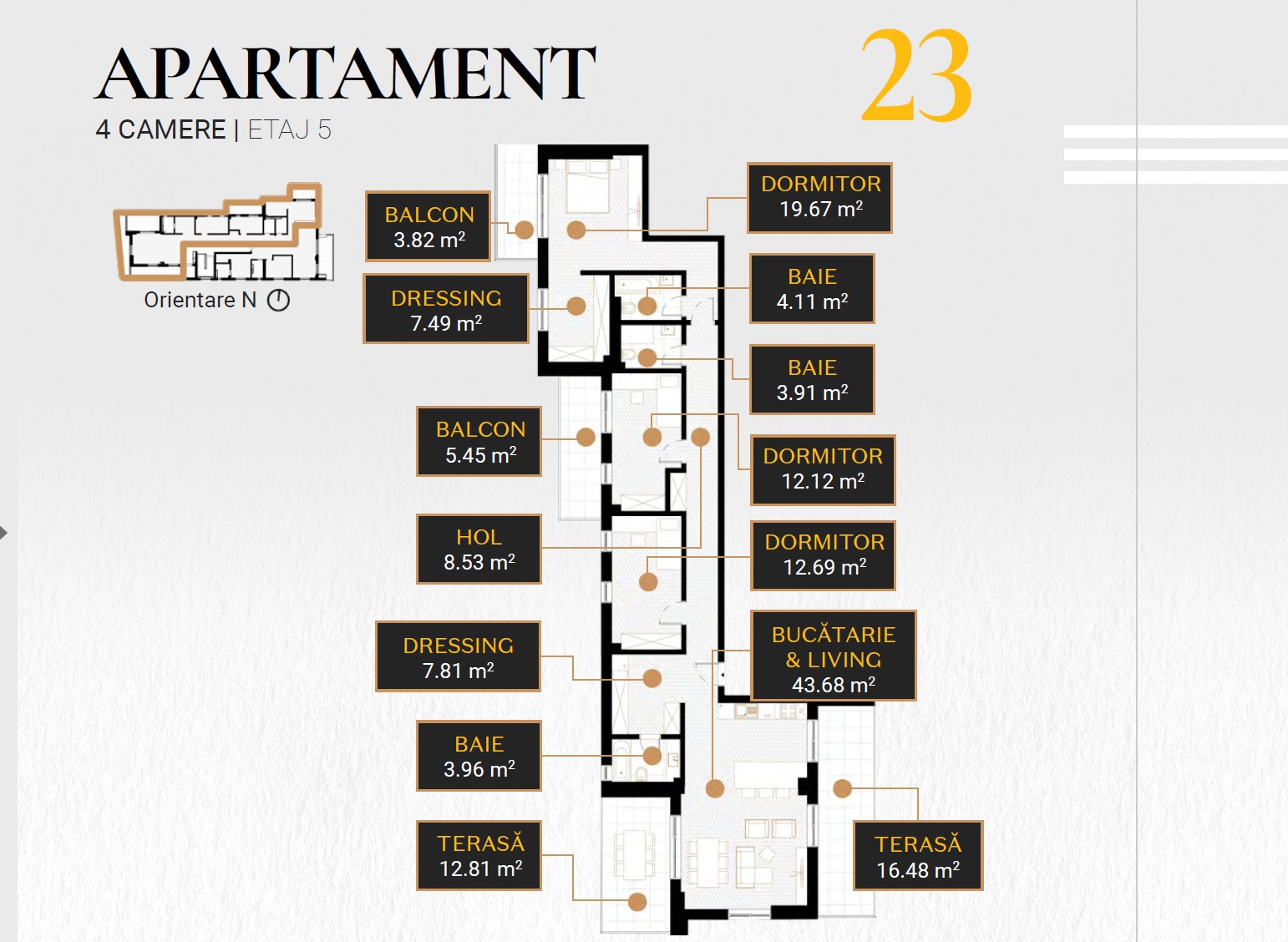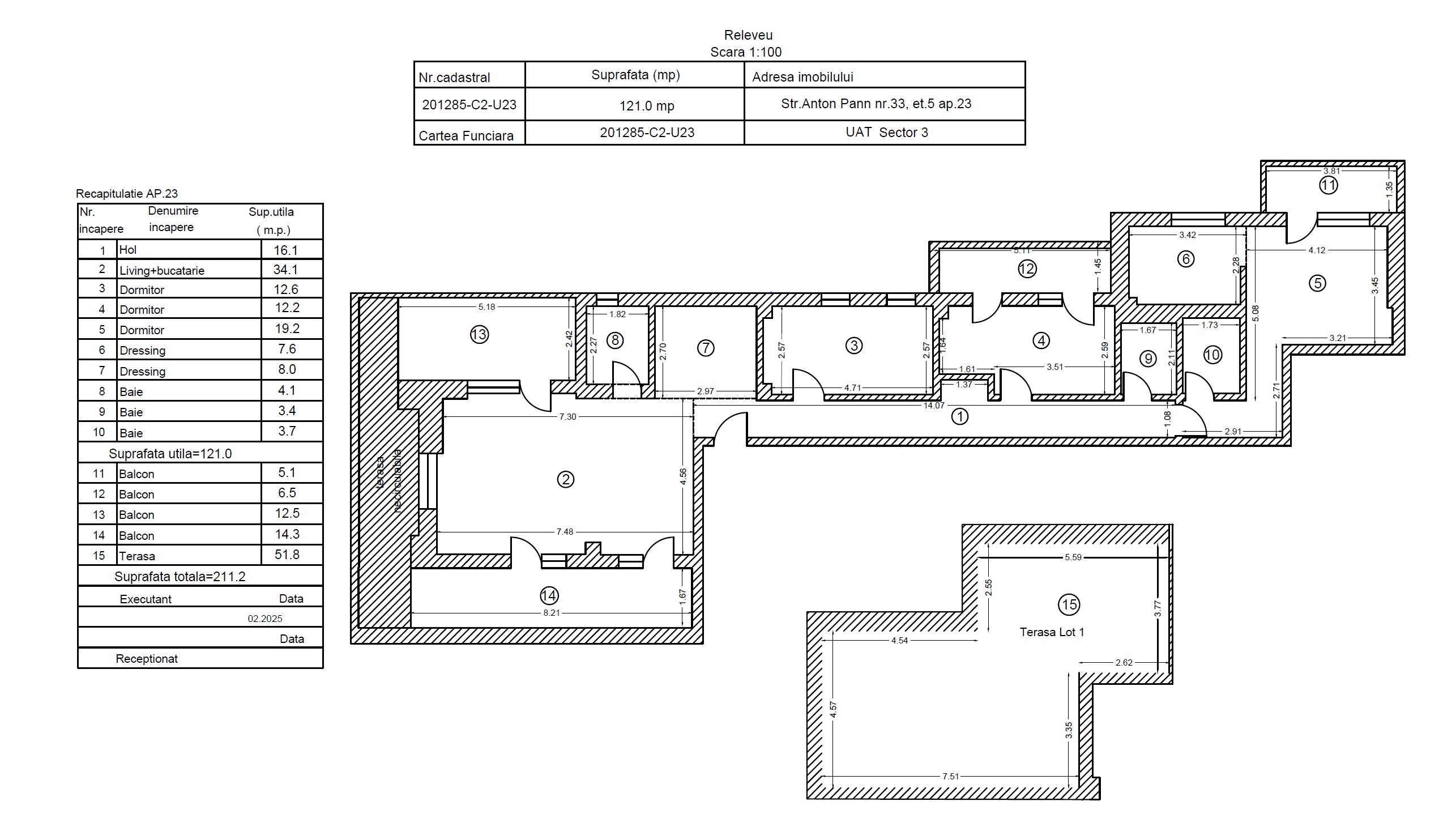 Apartamentul propus are o suprafata utila de 121 mp + terase de 90 mp. Suprafata construita a apartamentului este de 251.85 mp.