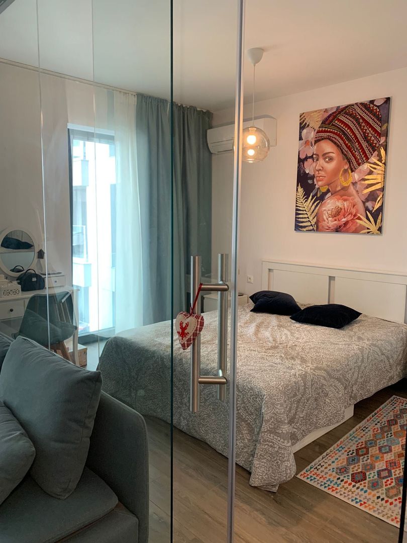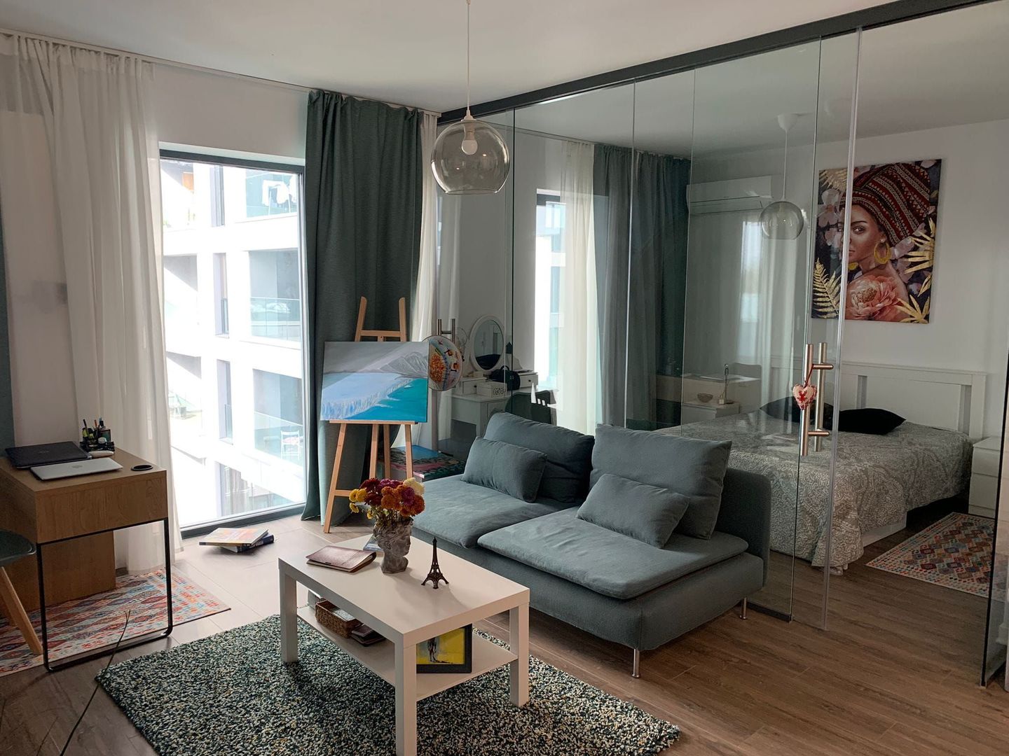 Studio dublu cu o compartimentare inteligentă, zona de dormit seaparata.
