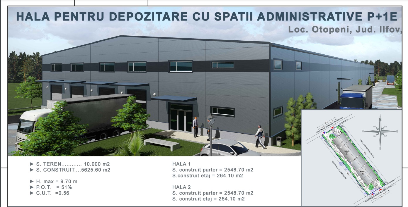 • Autorizatie obtinuta pentru: construire doua hale de depozitare cu spatii administrative si showroom P+1E.