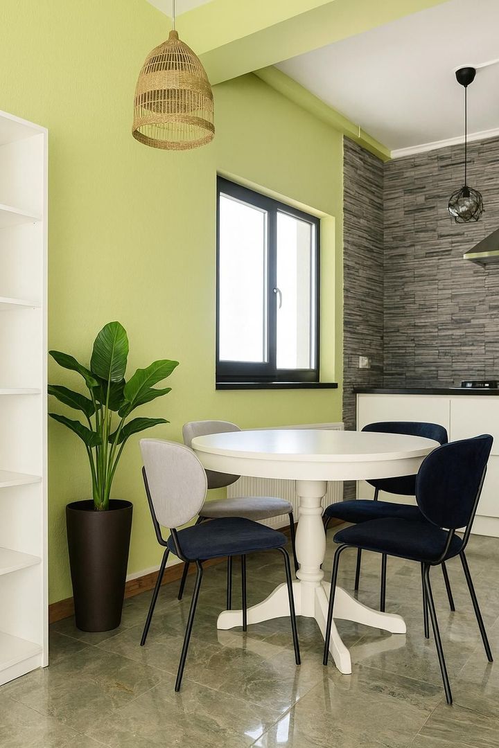 Parter: living generos cu zonă de dining, bucătărie open-space, vestibul, baie și terasă cu ieșire către grădină.